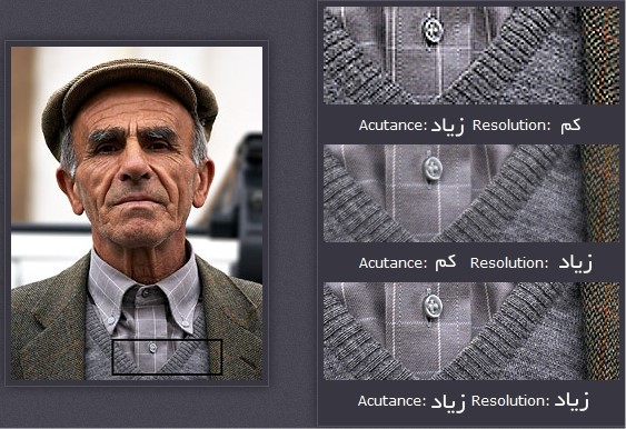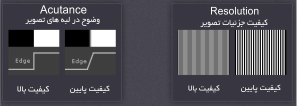 - Acutance: مفهوم میزان واضح بودن لبههای تصویر را میرساند، هر چه مقدار بالاتر باشد لبههای تصویر ما و حاشیههای ما واضحتر خواهد بود.