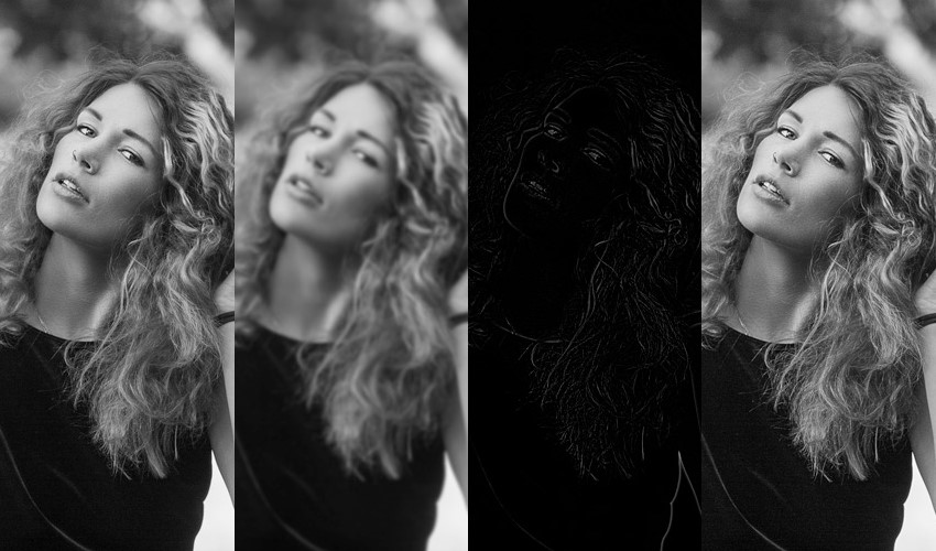 در تصویر بالا از چپ به راست افکتUnsharp Mask را در فوتوشاپ بازسازی کردیم. اولین عکس فایل اصلی، دومی یک کپی تار، سومی اختلاف این دو از همدیگ است تا لبهها قابل تشخیص باشند، و چهارمی تصویر اصلی است که با استفاده از لایه لبهها شارپ شده است.