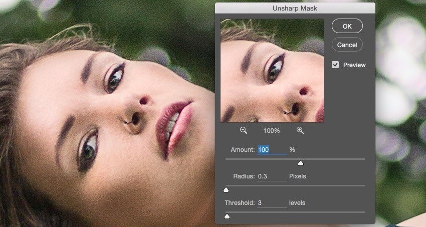 بر این اساس که چقدر میخواهید تصویر را شارپ کنید، اندازهای بین100%تا200%را وارد کنید. شعاع را تا 0.1 پایین بیاورید و سپس به آرامی آن را افزایش دهید تا زمانی که کنتراست لبه به جزئیات مهم اضافه بشود. در نهایت، نگاهی به مناطق یکدست تصویر بهخصوص سایهها بیندازید. آستانه را تا زمانی افزایش دهید که هر نویزی که بطور تصادفی شارپ شده، از بین برود. این از اصول ابتدایی شارپ کردن تصویر دیجیتال میباشد.