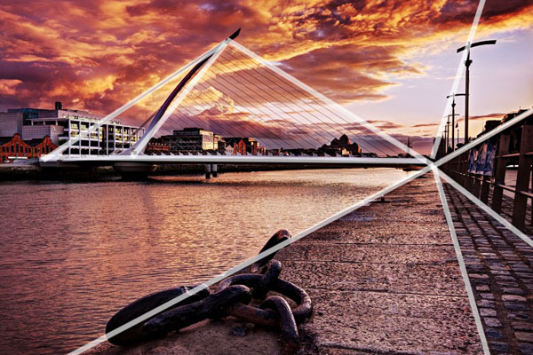 این عکس از پل ساموئل بکت در دوبلین، تعداد زیادی مثلث و خطوط مورب را با صحنه آمیخته است. این پل به خودی خود یک مثلث واقعی است (در واقع قرار بود کنار آن چیزی شبیه یک ساز چنگ باشد). همچنین چند مثلث ضمنی در صحنه وجود دارد. توجه کنید که چگونه خطوط هدایتگر در سمت راست کادر تماما قطری هستند و مثلث هایی را تشکیل می دهند که همه در همان نقطه بهم می رسند. این مثلث ها ضمنی هستند. داشتن خطوط قطری که به جهت های مختلف می روند تنش پویای زیادی به صحنه می افزاید. یک بار دیگر می توانید ببینید که من چگونه دو روش را برای ایجاد تصویر ترکیب کرده ام: خطوط هدایتگر و قطری.