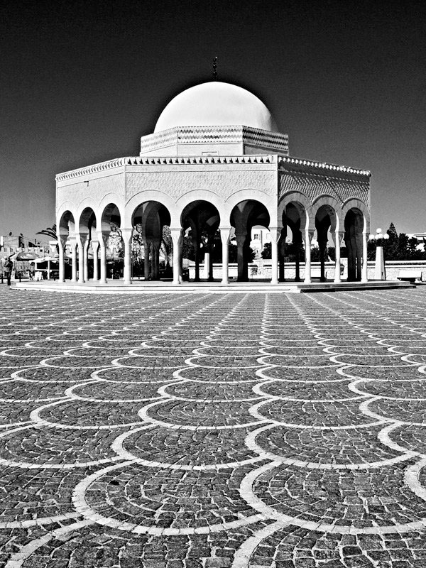 عکس بالا در تونس گرفته شده است. من الگوی سنگ فرش ها را برای هدایت چشم به ساختمان گنبدی شکل استفاده کرده ام. خود ساختمان شامل الگویی در قالب یک ردیف از قوس هاست. سقف گنبدی شکل هم قوس های زیرینش را تکمیل کرده است.