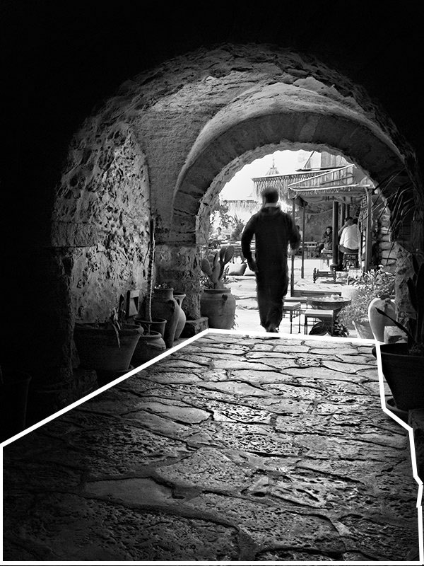 در تصویر دوم هم که در تونس گرفته شده، من بافت سنگی که روی زمین کار شده را واقعا دوست دارم. این الگو نسبت به الگوی عکس اول نظم کمتری دارد، اما بازی نور و سایه بر روی سطح بسیار خوشایند است. بافت های جالبی هم بر روی دیوارها و سقف این راهرو وجود دارد. همچنین ممکن است متوجه شده باشید که سقف قوس دار یک «کادر در کادر» در اطراف آن مرد و کافه ی آن طرف گذرگاه ایجاد کرده است.