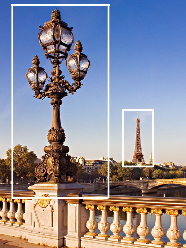 عکس بالا استفاده از قانون ترکیب بندی مثلث ها را به شیوه ای زیرکانه تر نشان می دهد. سر مجسمه ها یک مثلث ضمنی ایجاد می کند. این خط ما را به برج ایفل در دورتر هدایت می کند. تقاطع خط کوچکتر در سمت چپ با خط بلندتر درست در وسط برج ایفل رخ می دهد. خط کوچکتر در سمت راست درست بین دو مجسمه قرار می گیرد. قانون مثلث ها یک شیوه ی پیچیده ی تنظیم عکس به نظر می رسد، اما ترکیب بندی هایی واقعا قابل توجه ارائه دهد.