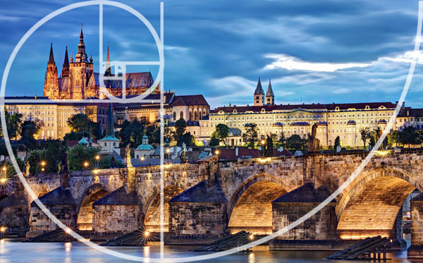 نسبت طلایی می تواند در جهات مختلف تنظیم شود. در این عکس گرفته شده در پراگ، مارپیچ ما را از سوی پل به سمت قلعه در ساحل دورتر هدایت می کند. یک خوش شانسی دیگر!